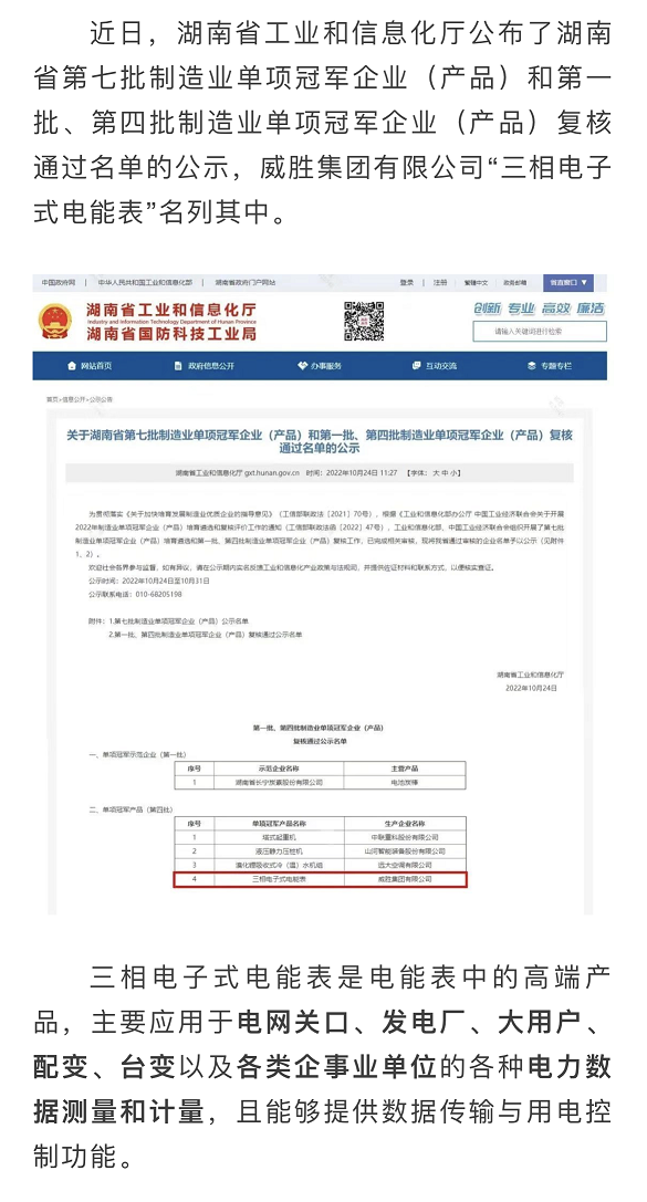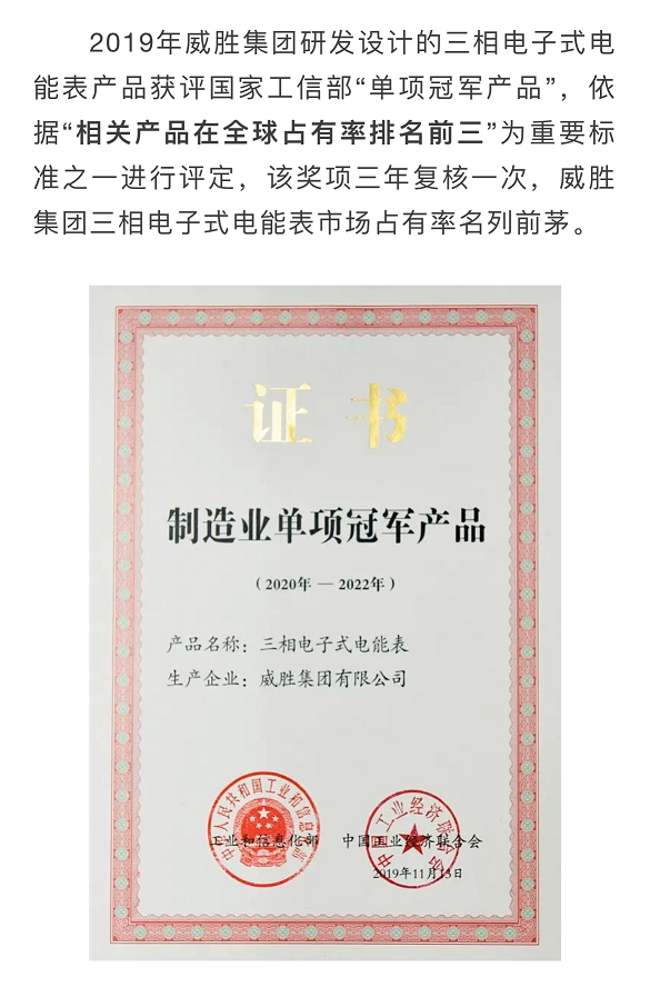 威胜集团通过国家工信部制造业单项冠军产品复核